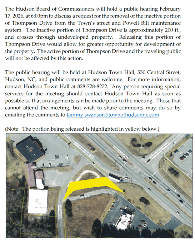 The Hudson Board of Commissioners will hold a public hearing on Tuesday, February 17, 2026 at 6:00pm to discuss a request to remove the inactive portion of Thompson Drive from the Town's maintenance and Powell Bill program. The meeting will be held at Hudson Town Hall, 550 Central Street, Hudson, NC, and the public is invited to attend. Click here for more info.