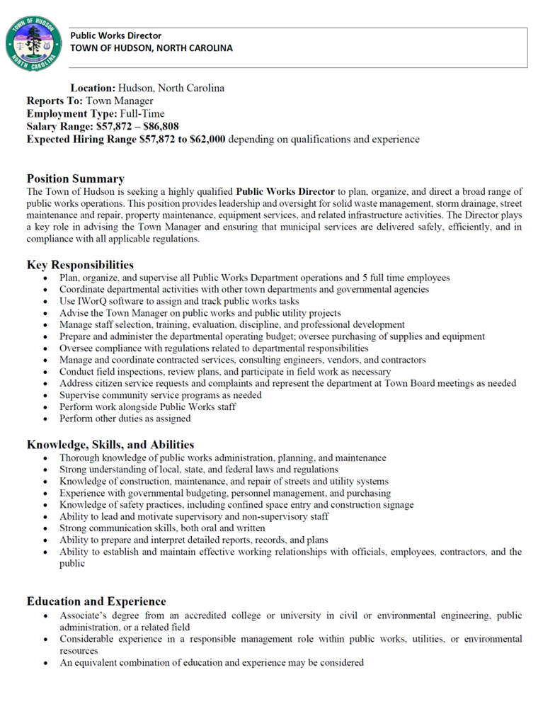 The Town of Hudson has approximately 23.9 miles of paved streets or roads within the Town Limits. There are currently no unpaved Town streets in Hudson. The Public Works Department maintains the paving, resurfacing and damage repairs to the Town streets as needed.